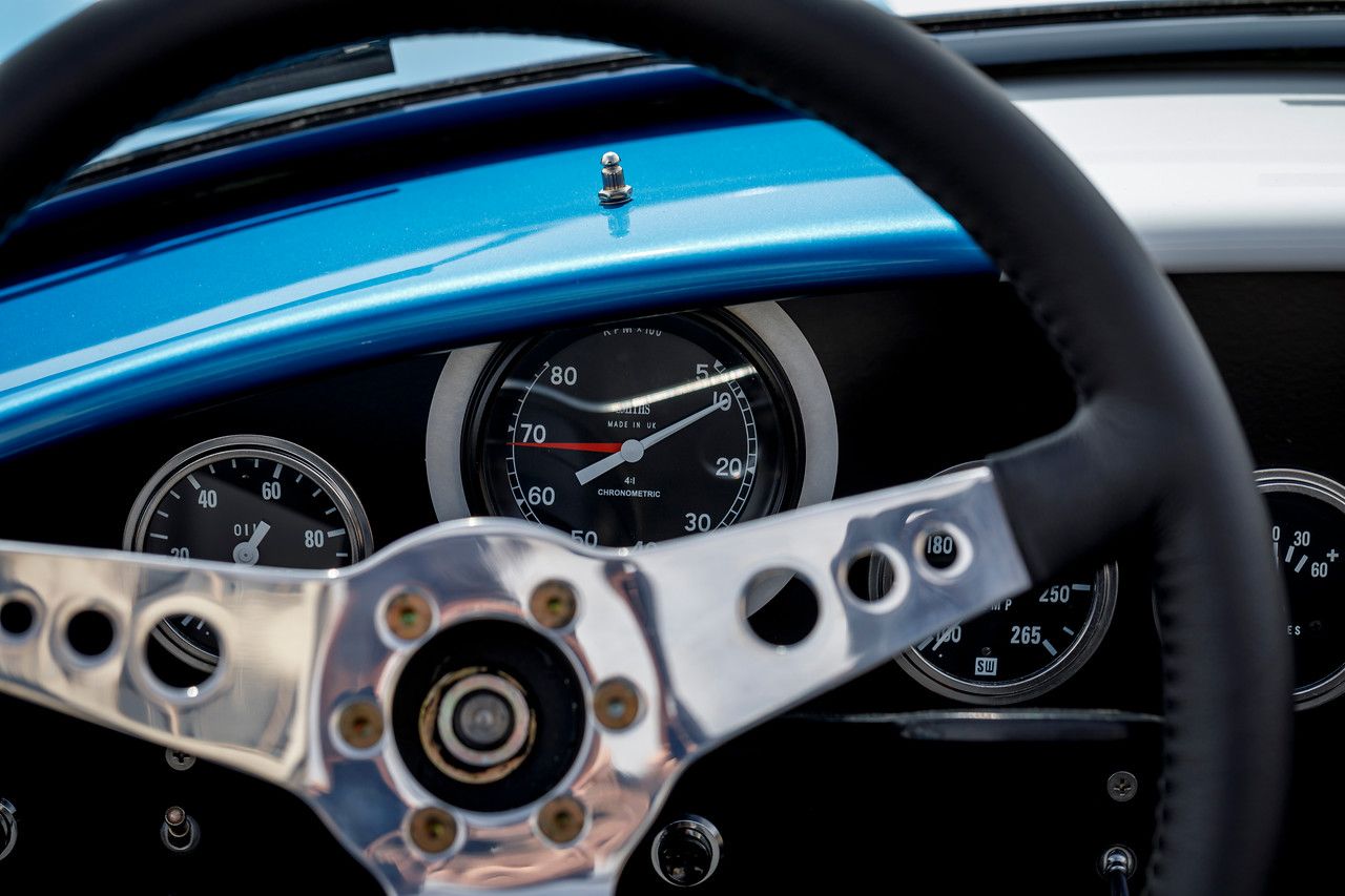 Under the hood of the originals resided a race 260 or 289 equipped with Webers. Only the first 75 cars were fitted with the 260 before the switch to the 289. The FIA cars also featured a Harrison radiator expansion tank (sourced from a 1963 Corvette) that was fitted above the transverse spring, and side exhausts that exited at the rear of the doors.